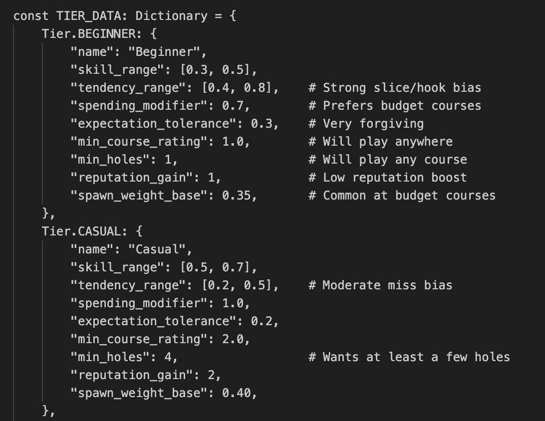 Tuning algorithms like the ball dispersion and golfer ability took a lot of trial and error. I started off by manually manipulating the variable values, restarting the game, and then letting a few golfers play a hole. This got tedious quickly. As an example, tuning each golfer tier was difficult to do directly in the code itself.