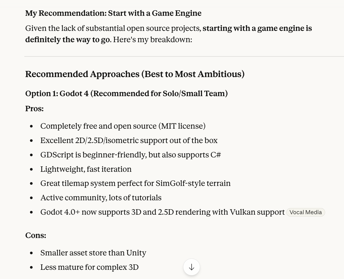 I knew of Unity but didn’t know much beyond it being a platform to build games. So I asked Claude for guidance on which engine would make sense for a solo project.