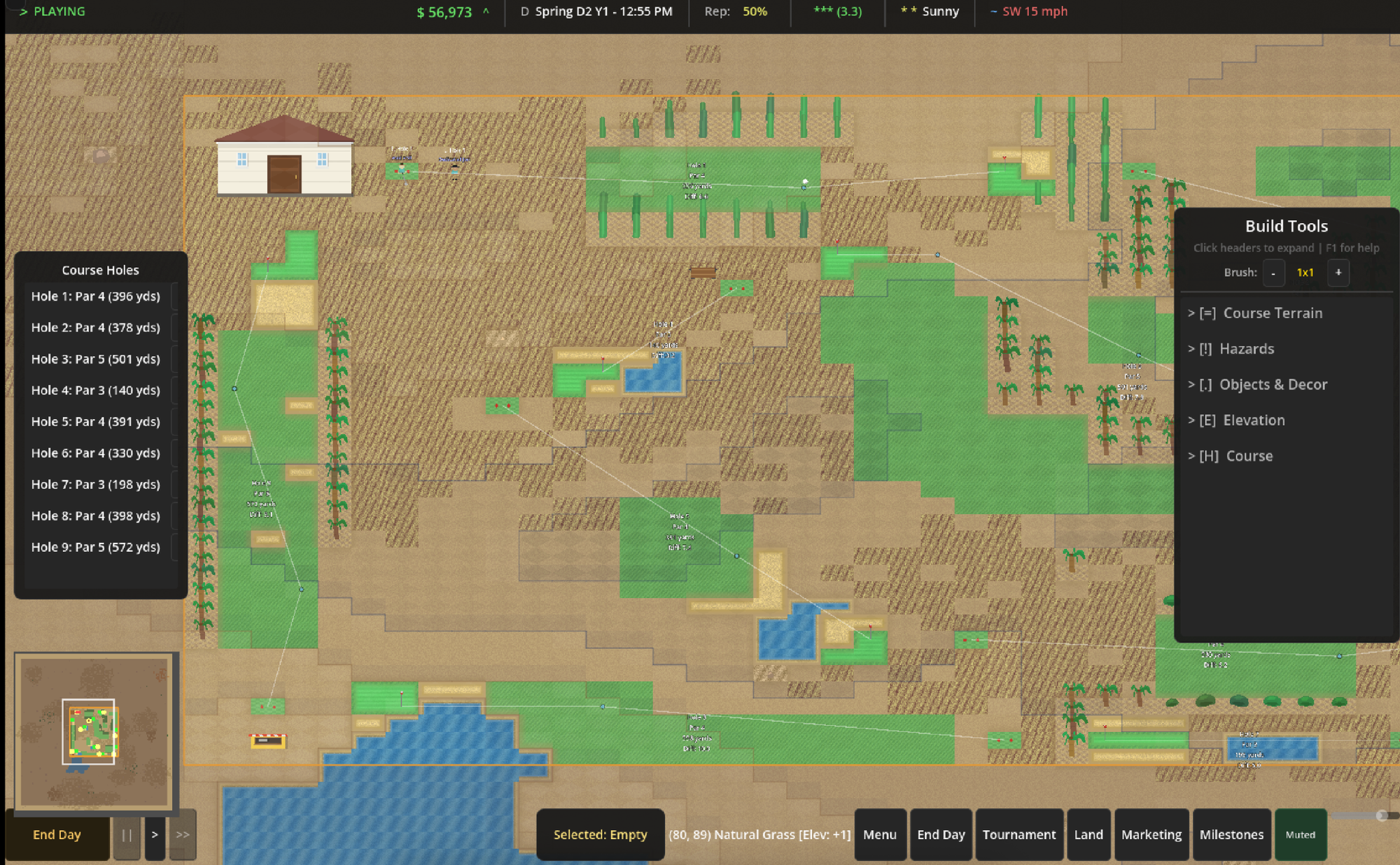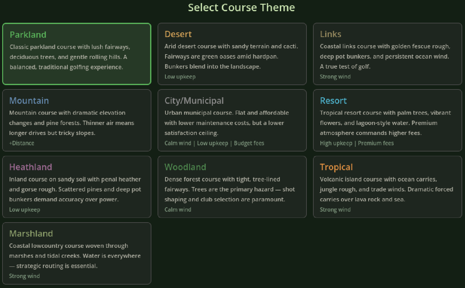 Choose your starting course land type. Then, build the golf course of your dreams and watch golfers either tear up your easy holes or have their dreams crushed by forced carries and deep bunkers.