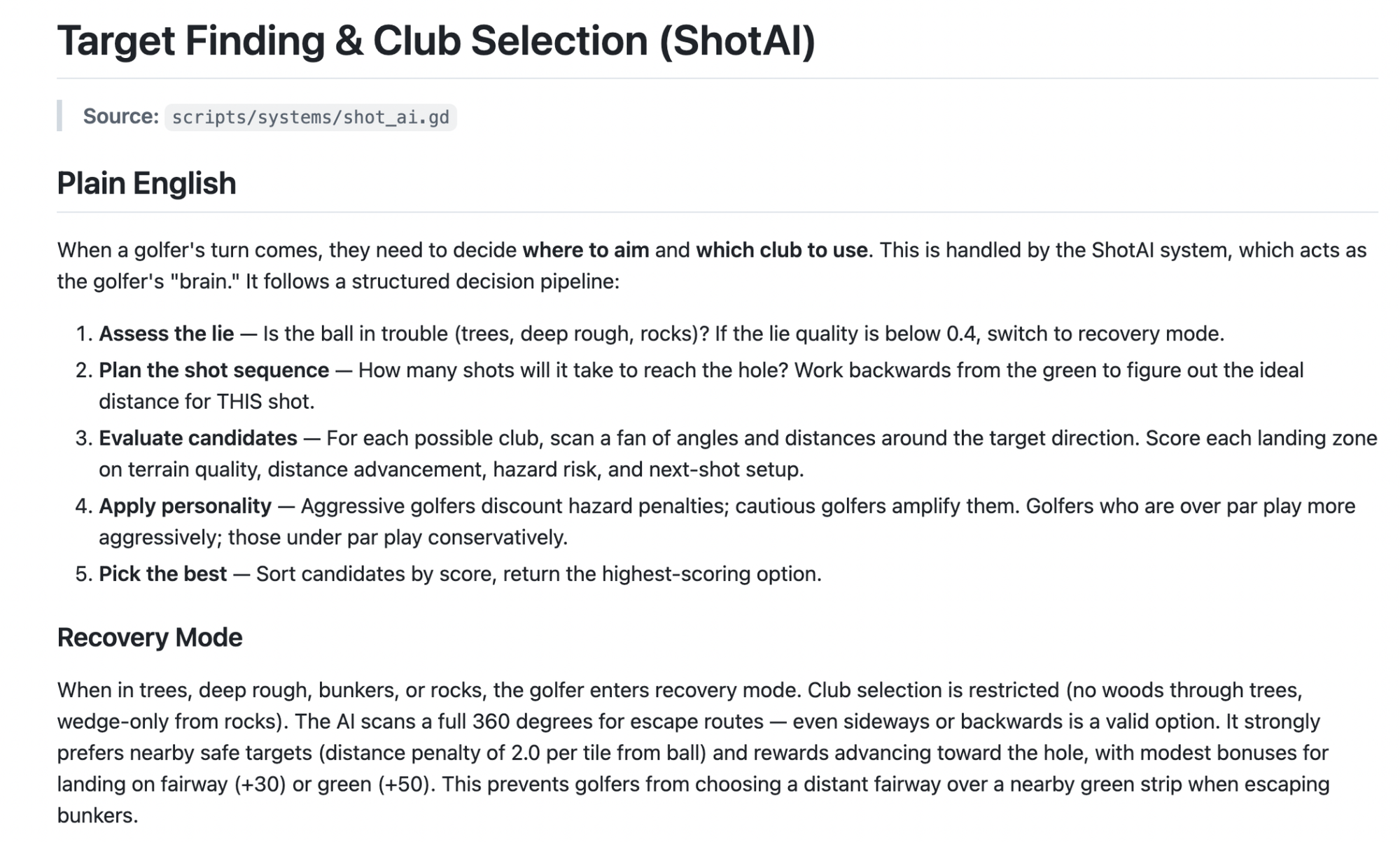 The initial versions really struggled — hitting balls into nonsensical places, putting from 30 yards off the green, choosing putters when they should’ve been chipping, etc. Claude took quite a bit of guidance from my own golfing background and sources like the USGA to get this right.