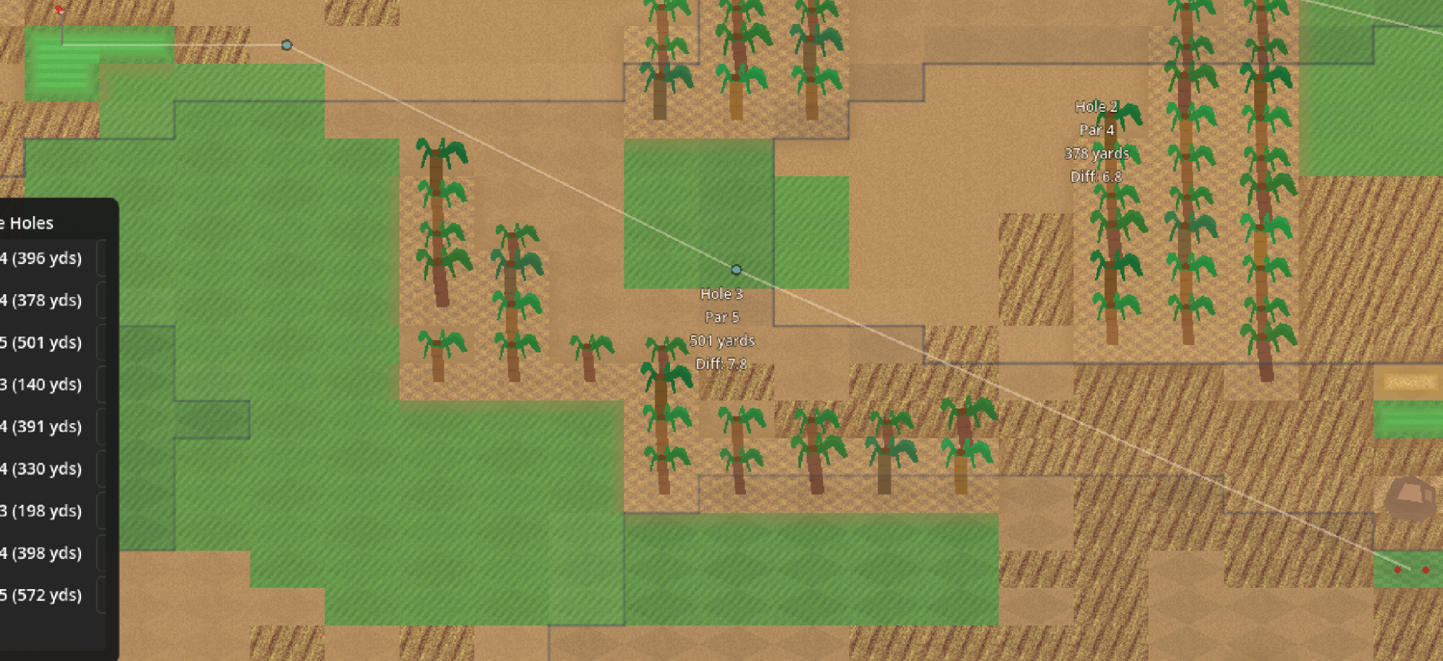 A few other systems worth mentioning: the golf rules engine closely follows real rules like no drops closer to the hole, pickups at net double bogey, and accurate par values based on hole distances. Ball flight required differentiating between drives, full iron/wedge shots, chips, and putts — plus backspin on wedge shots from better players. And golfer pathfinding was more difficult than I initially thought. After watching golfers fly across the screen, walk over water, and zigzag around, I was able to build a reasonable pathfinding system that actually looks realistic.