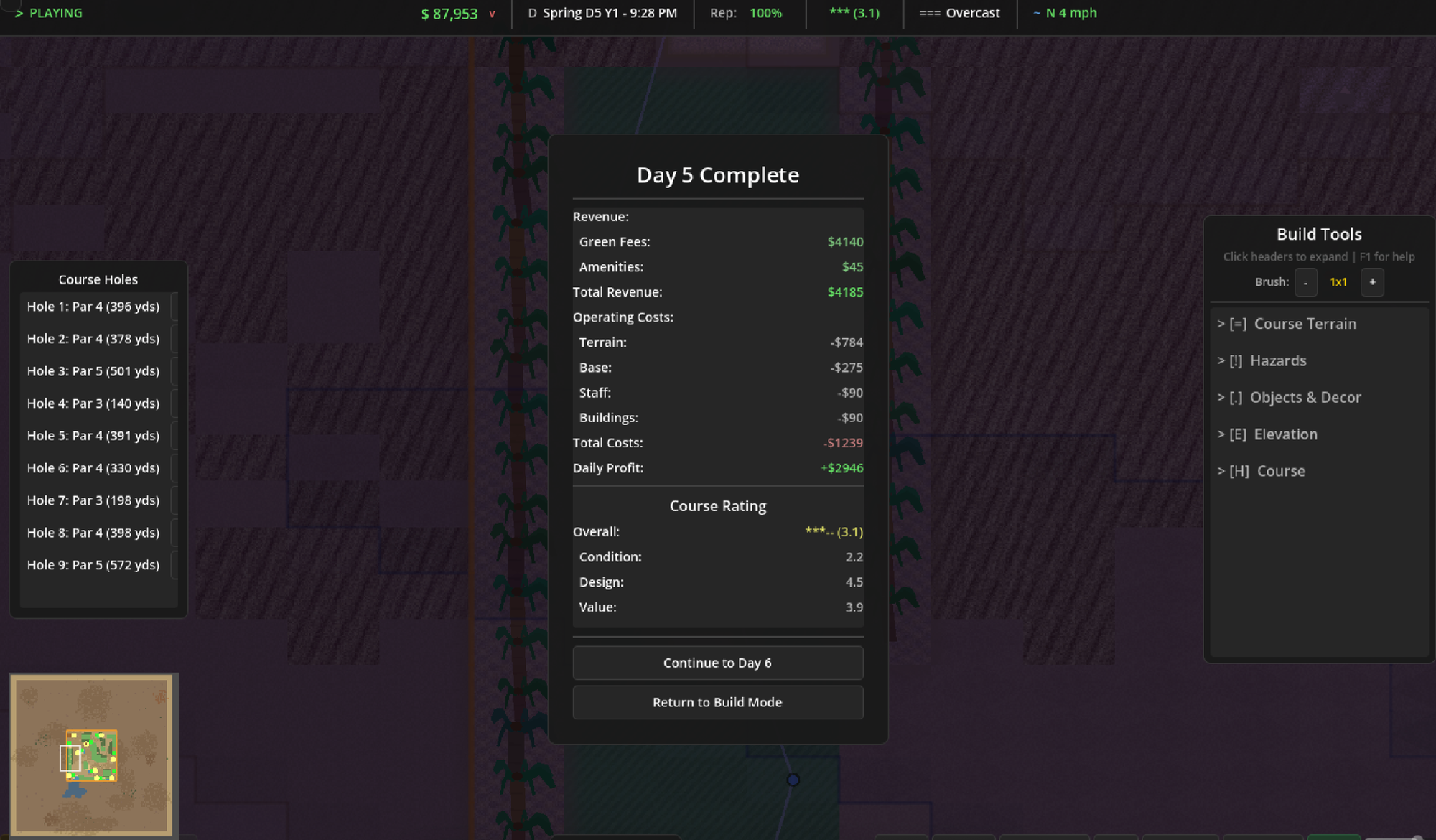 One of my favorite mechanisms in the original SimGolf was getting holes into the top 100 and top 18 globally. I built out a star and reputation system that lets you start with a small local muni and eventually work your way up to a world-class course.