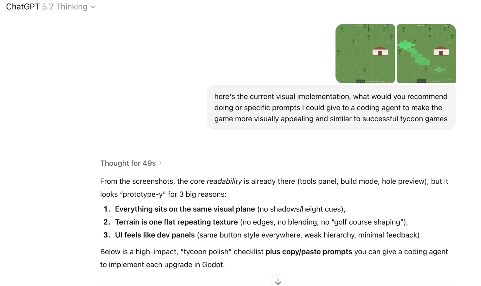 I’m not a talented artist, and neither is Claude, so we ended up with believable (but elementary) golfers, trees, rocks and buildings. It took a lot of restraint to not try and overhaul this, but I tried a number of different prompts and approaches to no avail.